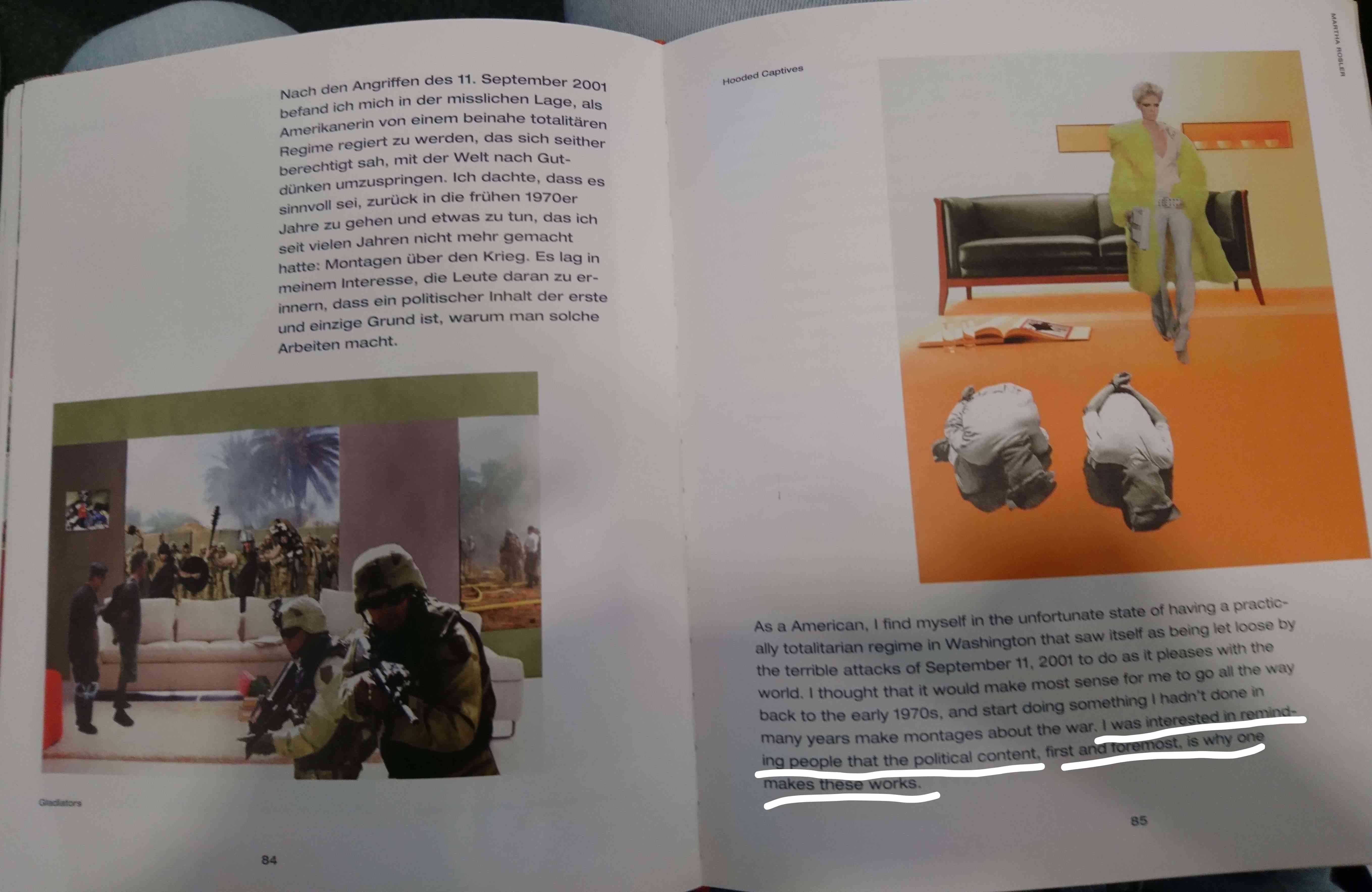 On the other hand, propaganda is people believing in the same idea. It is utilised by large organisations to sway the public opinion. Artists play with this notion and alter the message itself. For example, Martha Rosler's Gladiator (2004) juxtaposes photos of American Marines in somebody's living room. By using photos of Marines that the public can easily identify with, then gluing them in someone's house, it inevitably evokes a sense of confusion at this unwanted presence-- what the public American would have believed in America's involvement in the Gulf.
