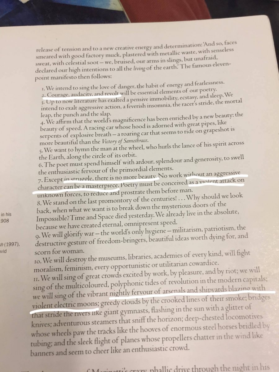 - As such, the project needs to exhibit a sense of dynamism, lots of energy, fearlessness, audacity and violence (all essential elements of Marinetti's manifesto)